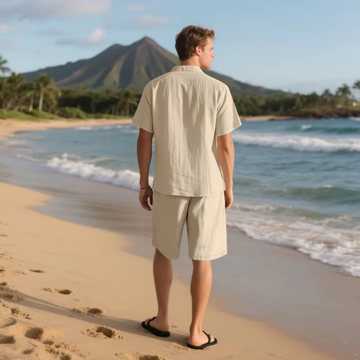 New summer men's retro cotton and linen shirt set, fashionable lapel button beach short-sleeved shirt and shorts two-piece set